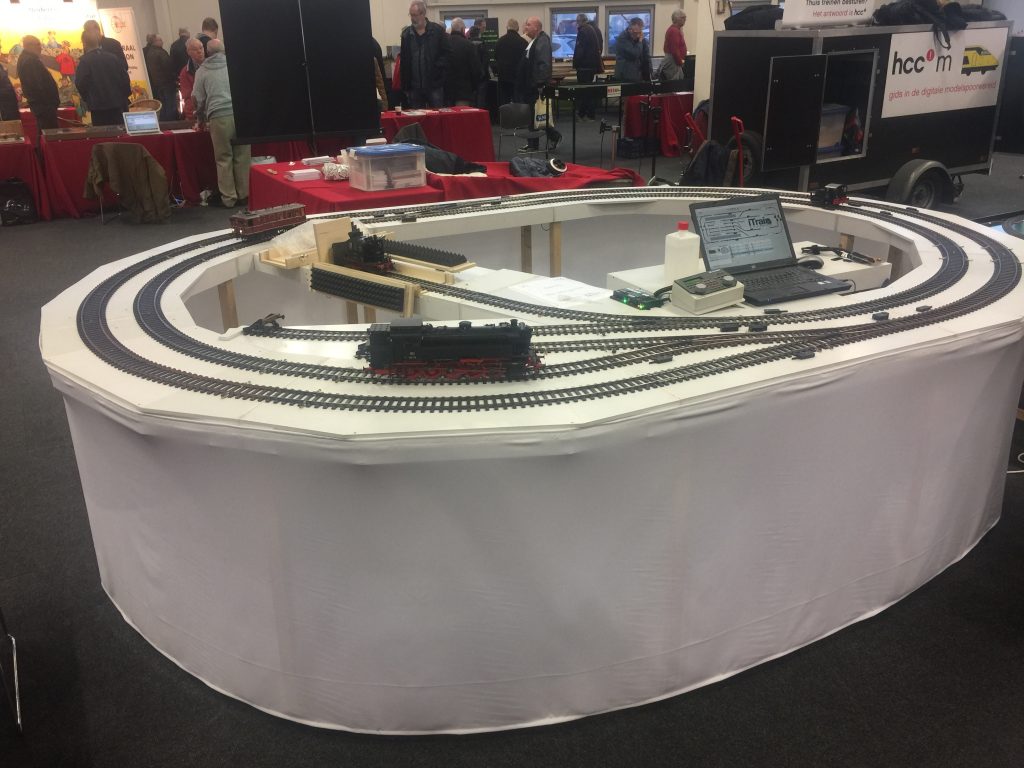 Voor demonstratie doeleinden heb ik een ovaal gebouwd, die goed te transporteren is en met 5 treinen bereden kan worden.
